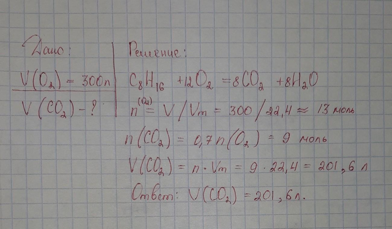 300 л воздуха было использовано для сжигания октена. Согласно уравнению реакции, в расчетах какой объем газа образуется в результате реакции?