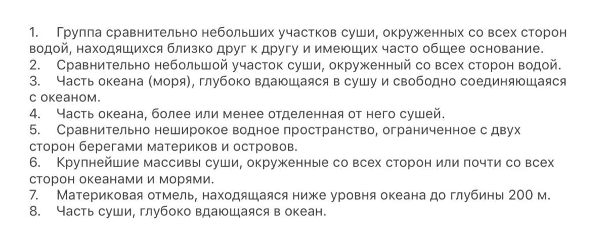 1 Архипелаг 2 Остров 3 Залив 4 Море 5 Пролив 6 Материк 7 Шельф 8 Залив