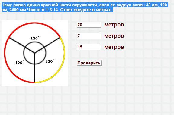 СРОЧНО!Чему равна длина красной части окружности, если ее радиус равен 33 дм, 120 см, 2400 мм Число π = 3.14. Ответ введите в метрах.
