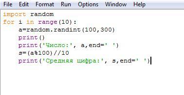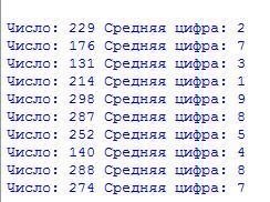 Напишите программу, которая заполняет массив из 10 элементов случайными числами в диапазоне [100,300] и выводит его на экран. После этого на экран выводятся средние цифры (число десятков) всех чисел, записанных в массив.Пример:Массив: 142 324 135 257 167 295 126 223 138 270 Число десятков: 4 2 3 5 6 9 2 2 3 7