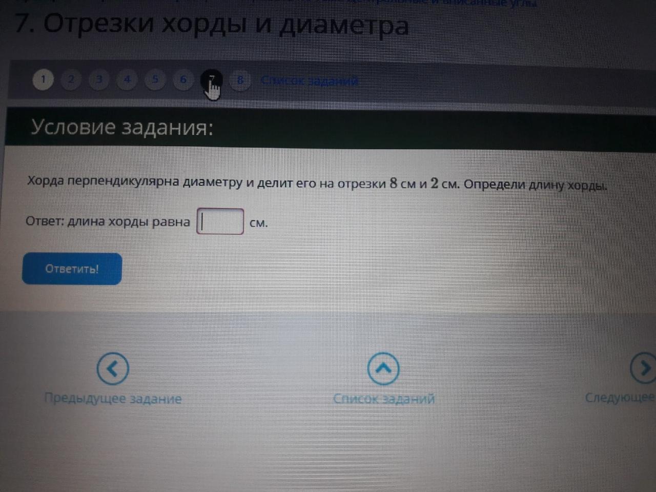 Хорда перпендикулярна диаметру и делит его на отрезки 8 см и 2 см. Определи длину хорды.