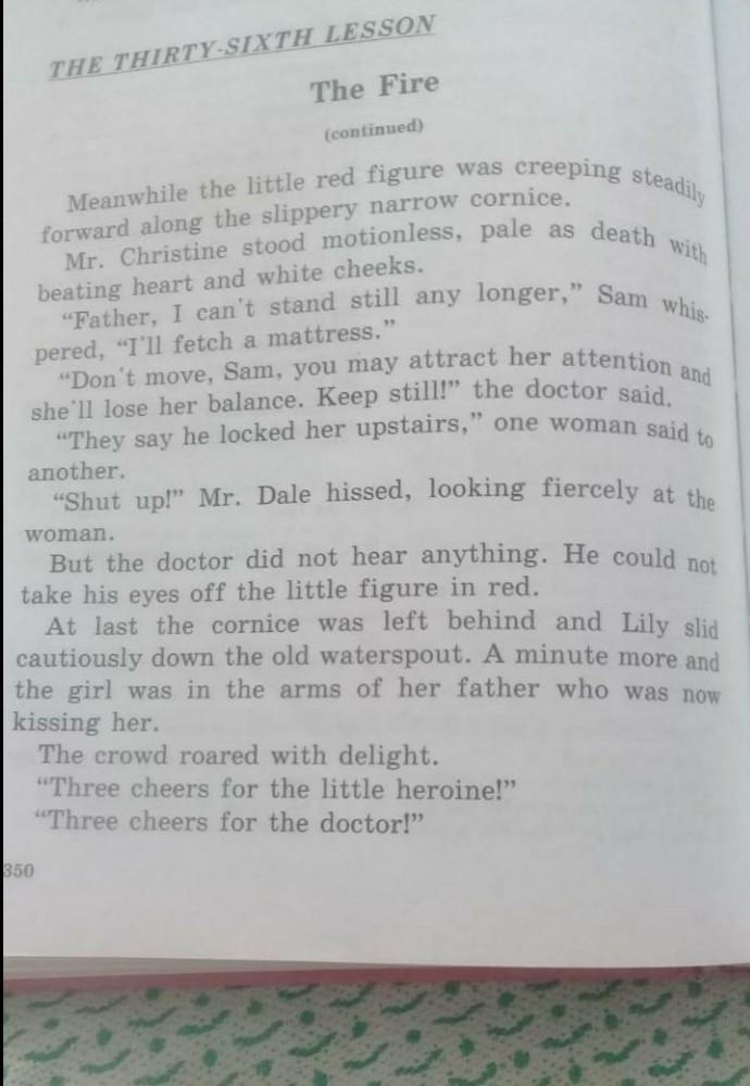 ТРИДЦАТЬ ШЕСТОЙ УРОК Огонь (продолжение) неуклонно ползет Тем временем маленькая красная фигура была впереди вдоль скользкого узкого карниза. Мистер Кристина стояла неподвижно, бледная, как смерть, с бьющимся сердцем и белыми щеками. «Отец, я больше не могу стоять на месте, - прошептал Сэм, - я принесу матрас». «Не двигайся, Сэм, ты можешь привлечь ее внимание, и она потеряет равновесие. Не двигайся!» доктор сказал: «Говорят, он запер ее наверху», - сказала одна женщина другой. "Заткнись!" Мистер Дейл прошипел, яростно глядя на женщину. Но доктор ничего не слышал. Он не мог отвести глаз от маленькой фигуры в красном. Наконец карниз остался позади, и Лили осторожно соскользнула в старую водосточную трубу. Еще минута, и девушка оказалась в объятиях своего отца, который теперь целовал ее. Толпа взревела от восторга. "Три ура для маленькой героини!" "Три ура для доктора!" 350