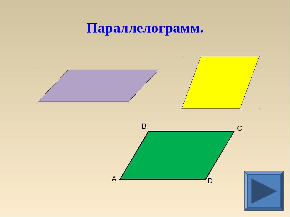 Параллелограмм — четырехугольник, у которого противоположные стороны попарно параллельны. Признаки параллелограмма: Если противоположные стороны четырехугольника попарно параллельны, то этот четырехугольник — параллелограмм.
