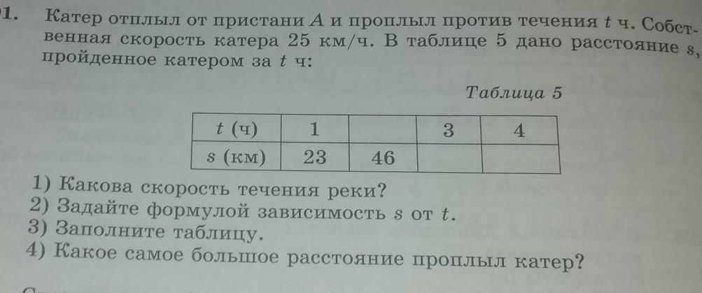 катер отплыл от пристани А и проплыл против течения t ч. Собственная скорость катера 25км/ч. В таблице 5 дано расстояние s пройденное катером за t ч.
