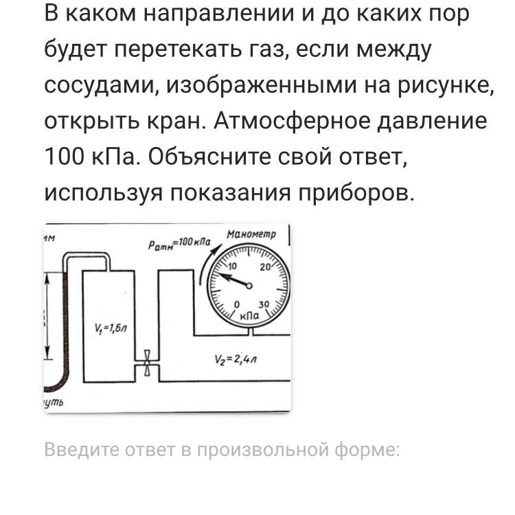 В каком направлении и до каких пор будет перетекать газ, если между сосудами, изображенными на рисунке, открыть кран. Атмосферное давление 100 кПа. Объясните свой ответ, используя показания приборов.