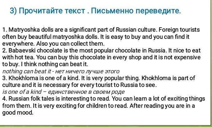 3. Хохлома единственный в своем роде. Это очень популярная вещь. Хохлома - это часть культуры, которую должен увидеть каждый турист в России. единственный в своем роде - eguHCTBEHHOE B CBOEM poge 4. Русские народные сказки интересно читать. Вы можете узнать много интересного из них. Детям очень интересно читать. После прочтения у вас хорошее настроение.