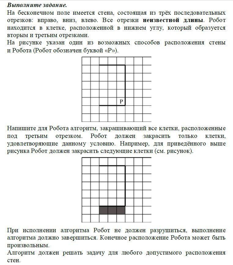 на бесконечном поле имеется стена состоящая из 3 последовательных отрезков вправо вниз влево все отрезки неизвестной длинны. Робот находится в клетке расположенной в нижнем углу, который образуется вторым и третьим отрезками