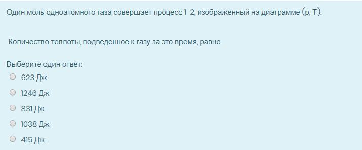 Один моль одноатомного газа совершает процесс 1-2, изображенный на диаграмме (р, Т). Количество теплоты, подведенное к газу за это время, равно