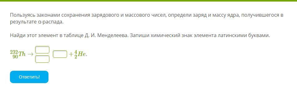 ПОМОГИТЕ!Пользуясь законами сохранения зарядового и массового чисел, определи заряд и массу ядра, получившегося в результате α-распада.