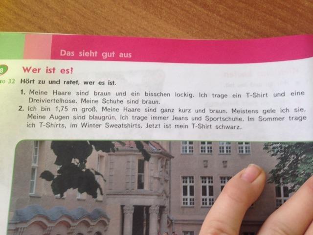2. Рост у меня 1,75 м. Волосы у меня очень короткие и каштановые. Я в основном наношу на них гель. Мои глаза сине-зеленые. Я всегда ношу джинсы и кроссовки. Летом я ношу футболки, зимой - толстовки. Сейчас у меня черная футболка.