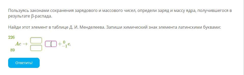 Пользуясь законами сохранения зарядового и массового чисел, определи заряд и массу ядра, получившегося в результате β-распада.