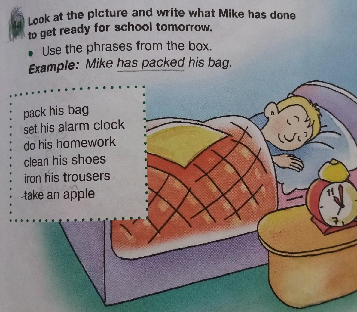 Короч 1)Mike has packed his bag 2)Mike has sets his alarm clock 3)Mike has did his homework 4)Mike has cleaned his shoes 5)Mike has ironed his trousers 6)Mike has took his apple
