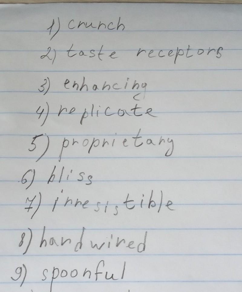 1.There’s science behind that ………………. . 2.The food industry is even researching the connection between ………………. on your tongue and the corresponding chemical reaction in your brain. 3.Here is the process for ………………. cheese flavor without the cheese. 4.If they can ………………. that chemical reaction that may happen on your tongue or an aroma, they can simulate the taste of something without it being at all real. 5.The food industry is extremely secretive, competitive and ………………. . 6.When they hit the perfect amounts, they call it “the ………………. point” for sugar, “the mouth fill” for fat, “the flavor burst” for salt, - they know that their products will be ………………. . 7.Scientists agree that these highly ………………. foods can be addictive. 8.it becomes ………………. and it’s very hard to overcome. 9.Just one ………………. lights up the happy zones of the brain in clinical trials