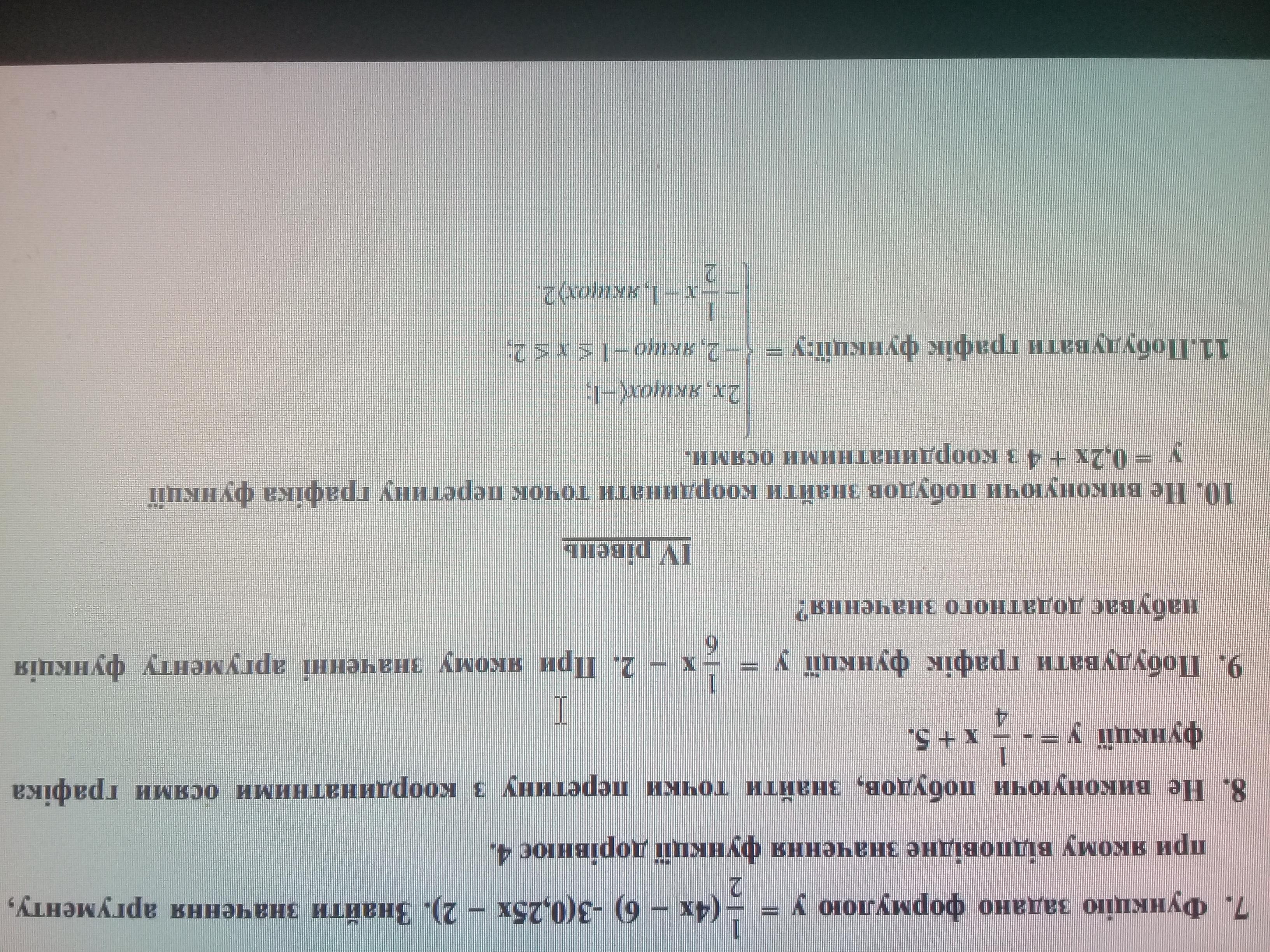 1.Функцію задано формулою у =1/2(4х – 6) -3(0,25х – 2). Знайти значення аргументу,при якому відповідне значення функції дорівнює 4.