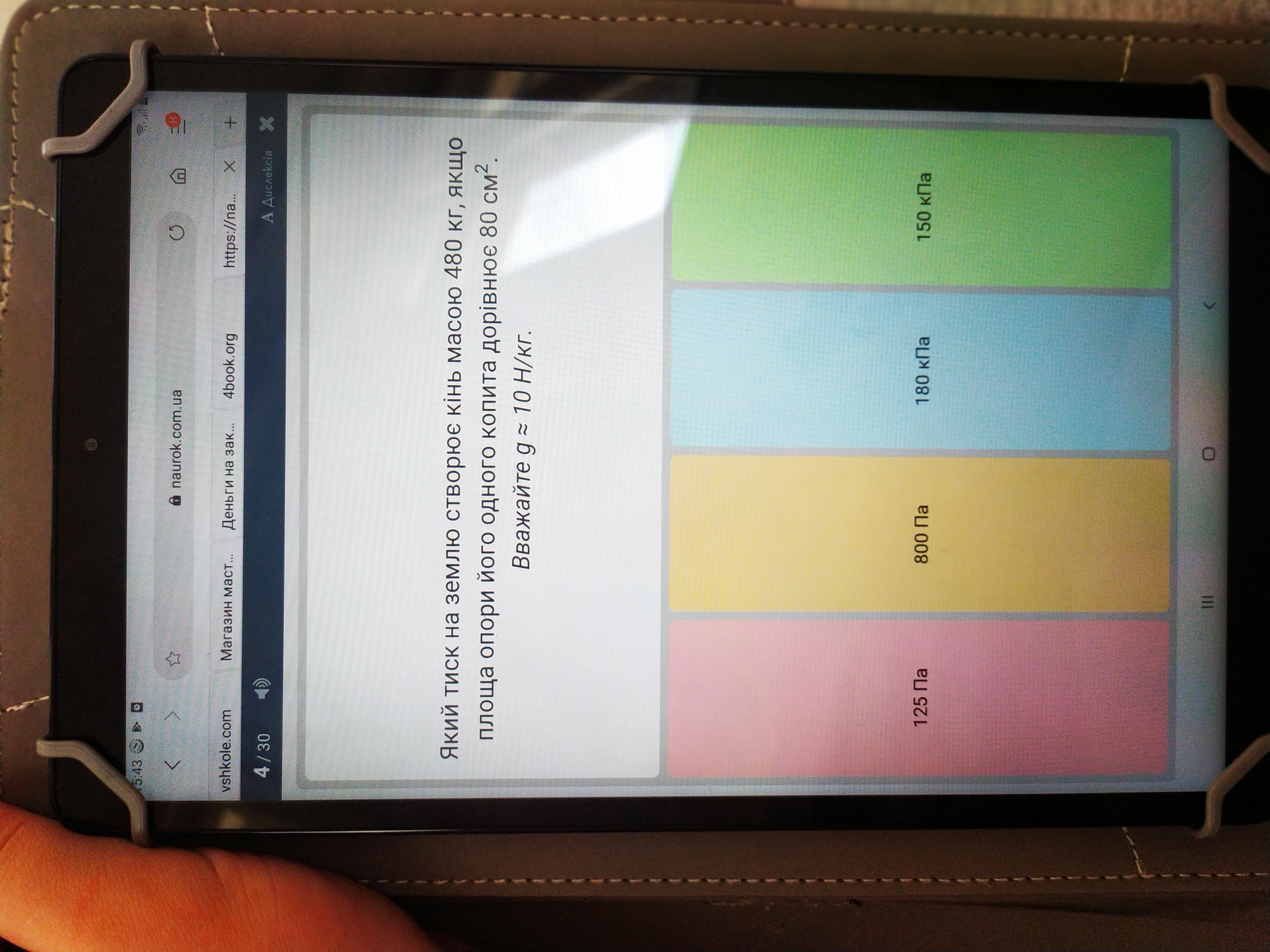 який тиск на землю створює кінь масою 480 кг, якщо площа опори його одного копита дорівнює 80 см2. Вважайте g=10 H/кг
