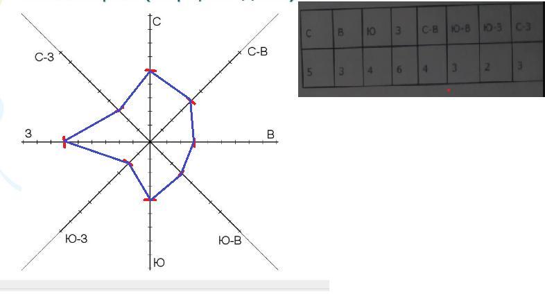 Например: "С 5" - означает, что направление ветра "северное", находим вектор с таким направлением (обозначен буквой С) и отсчитываем от центра пять "клеток". Ставим отметку (точку или черточку) на векторе.