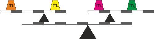 Дан многоуровневый рычаг, у которого масса противовеса m1=36кг. Каковы массы противовесов m2 , m3 и m4, если рычаг находится в состоянии равновесия?