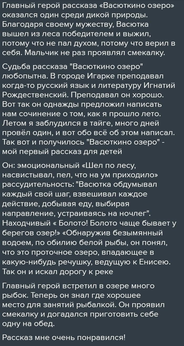 Ответ:В г.Игарка преподавал когда-то русский язык и литературу Игнатий Дмитриевич Рождественский, известный потом сибирский поэт. Преподавал он, как я теперь понимаю, свои предметы хорошо, заставлял на «шевелить мозгами» и не слизывать из учебников изложения, а писать сочинения на вольные темы. Вот так он однажды предложил написать нам, пятиклассникам, о том, как прошло лето. А я летом заблудился в тайге, много дней провёл один, и вот обо всём об этом и написал. Сочинение моё было напечатано в рукописном школьном журнале под названием «Жив». Много лет спустя я вспомнил о нём, попробовал восстановить его в памяти. Так вот и получилось «Васюткино озеро» – мой первый рассказ для детей».