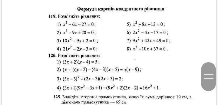119. \ 3)10 {x}^{2}  - 9x + 2 = 0 \ d =  {b}^{2}  - 4ac = 81  - 80 = 1 \ x1 =  frac{9 - 1}{2 times 10} = 0.4 \ x2 =  frac{9 + 1}{2 times 10}   = 0.5