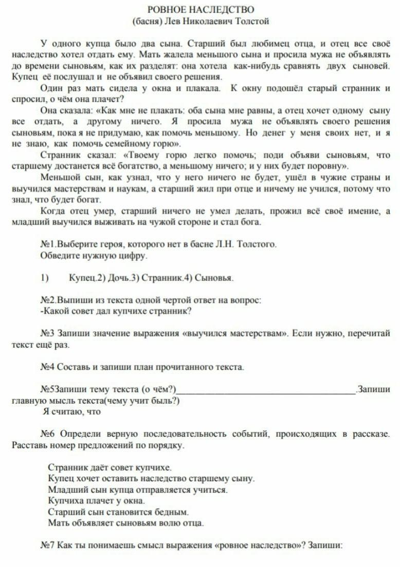 2. <<твоему горю легко помочь: поди объяви сыновьям, что старшему достанется все богатство, а меньшому ничего, и у них будет поровну>>.