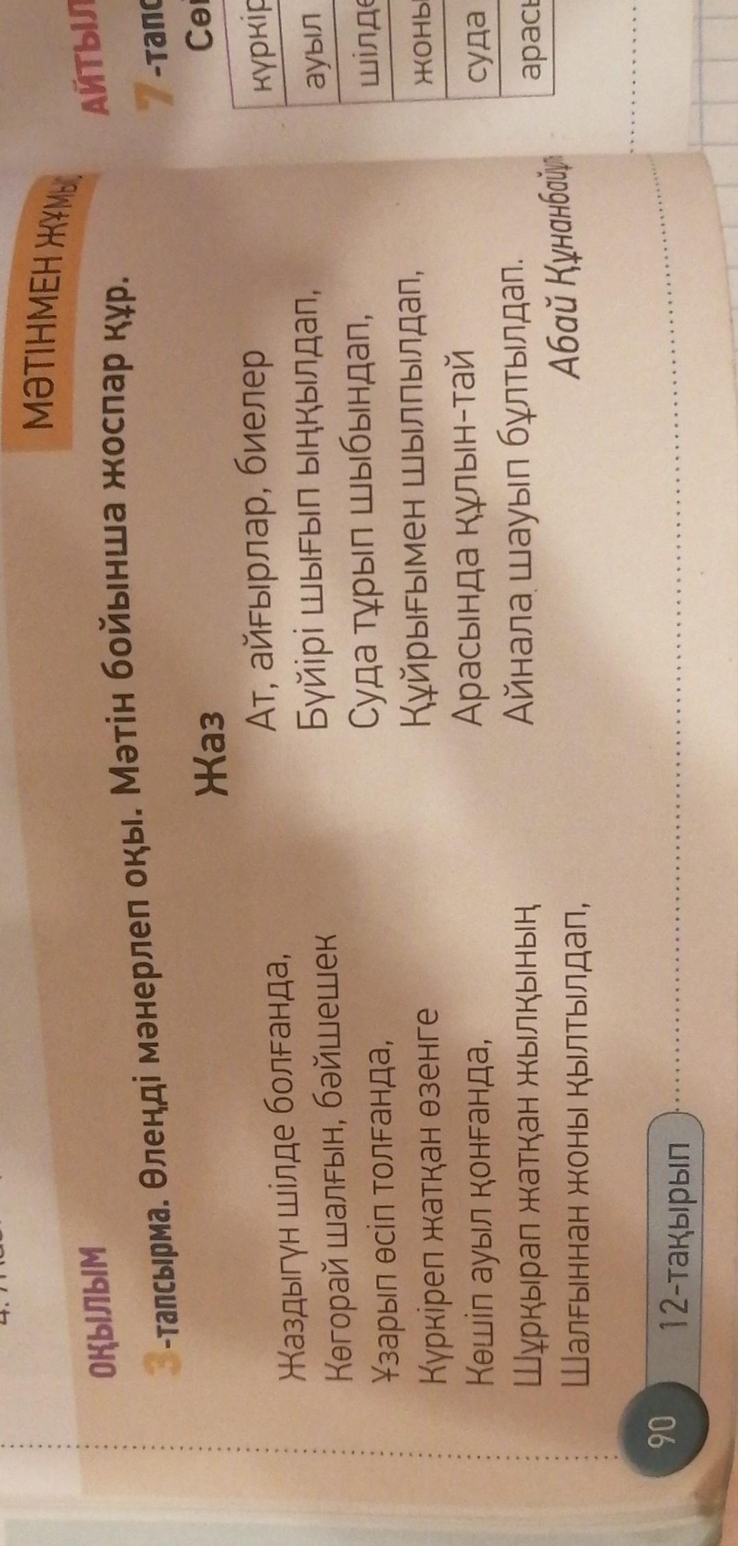 1.Өлең не туралы? 2.Бәйшешек, көкорай шалғын қашан ұзарып өседі? 3.Ауыл қашан өзеннің жағасына көшіп келеді? 4.Жазда ауылдың өмірі қандай? 5.Суда нелер шыбындап тұрады?