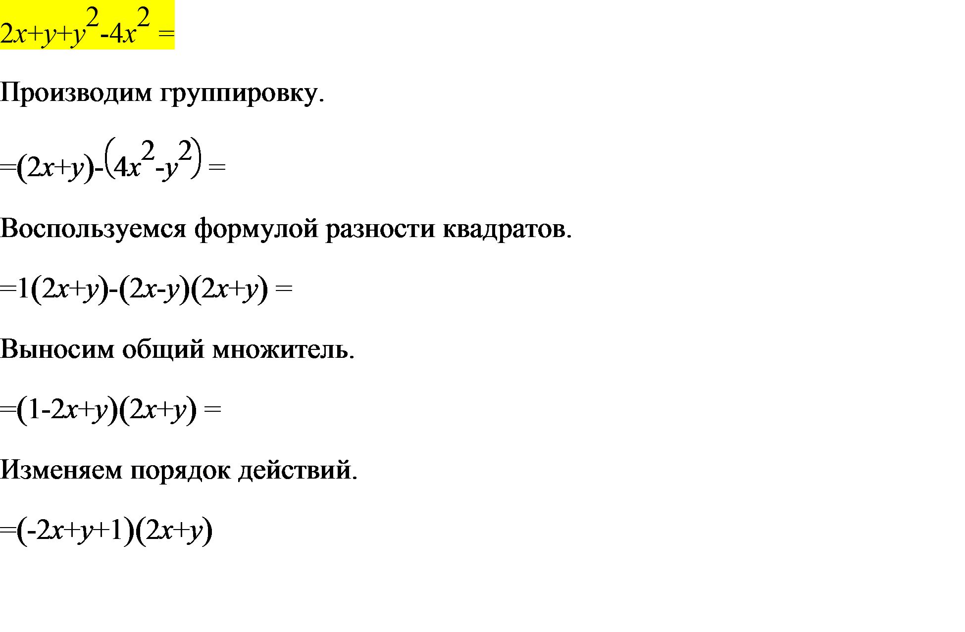 2x+y+y^2-4x^2 = (2x+y)-(4x^2-y^2)=(2x+y)-(2x+y)(2x-y)=(2x+y)(1-2x+y)