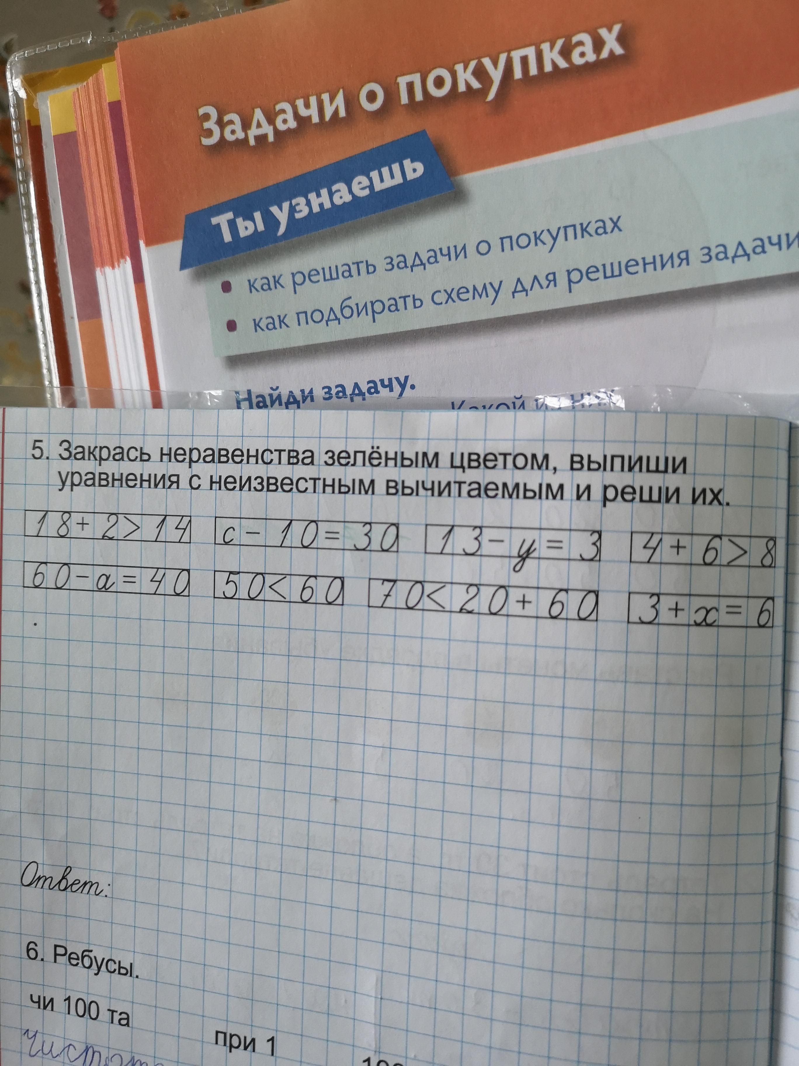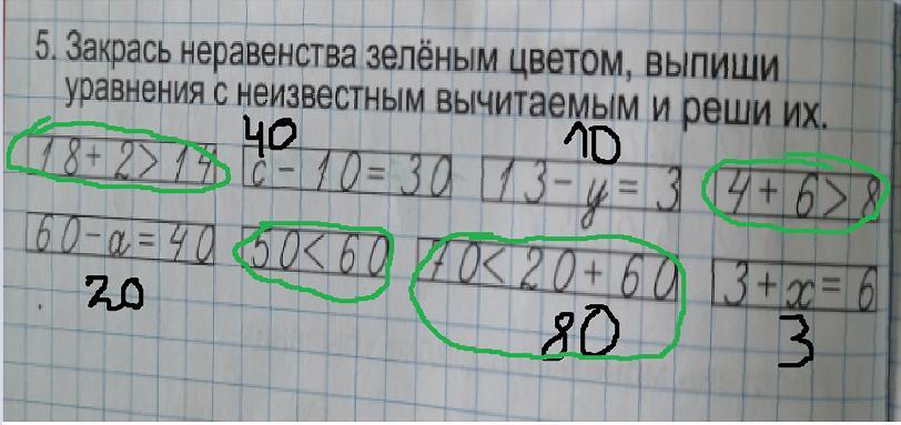 закрась неравенства зелёным цветом, выпиши уравнения с неизвестным вычитаемым и реши их.