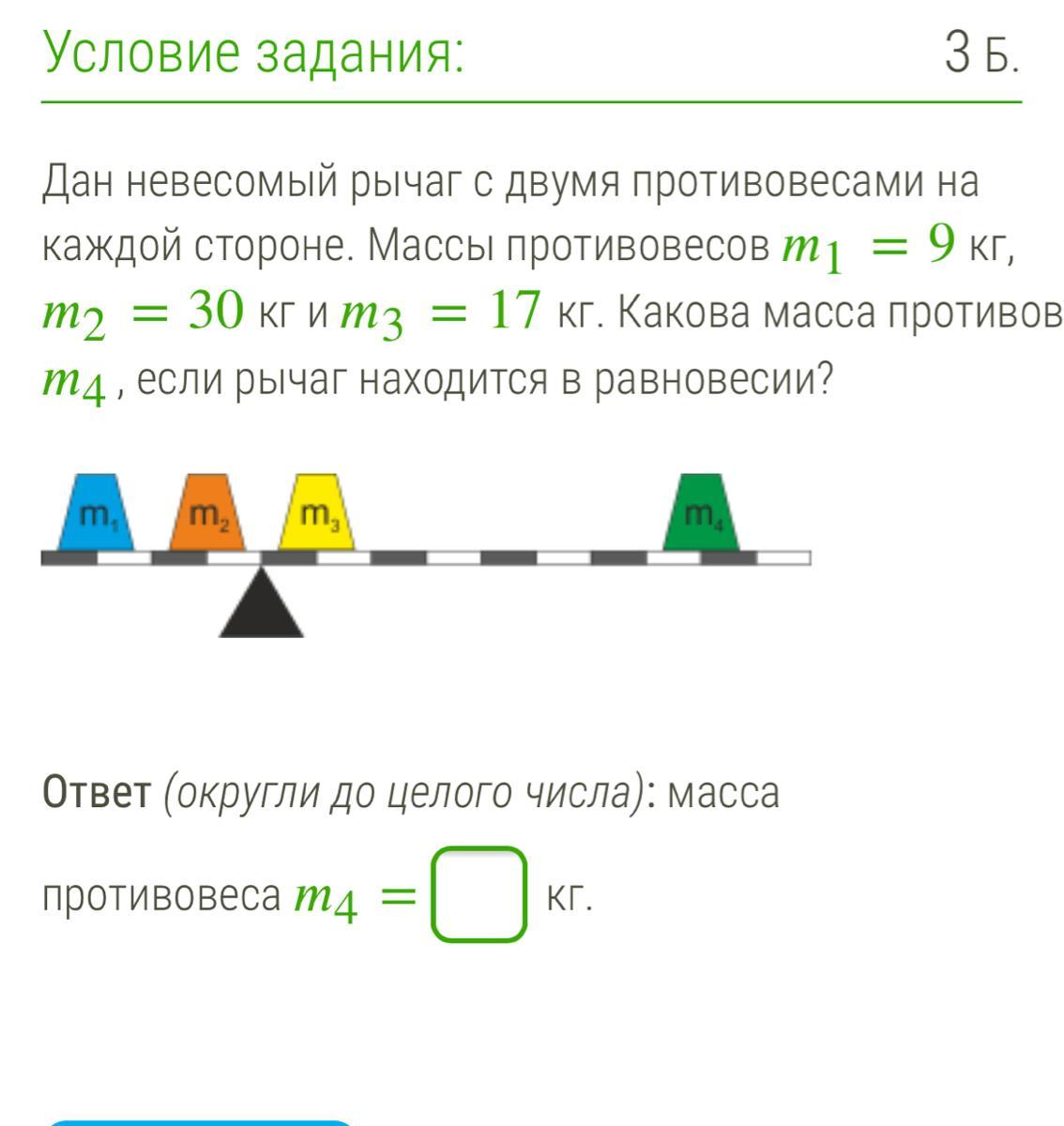Дан невесомый рычаг с двумя противовесами на каждой стороне. Массы противовесов 1=9 кг, 2=30 кг и 3=17 кг. Какова масса противовеса 4, если рычаг находится в равновесии?