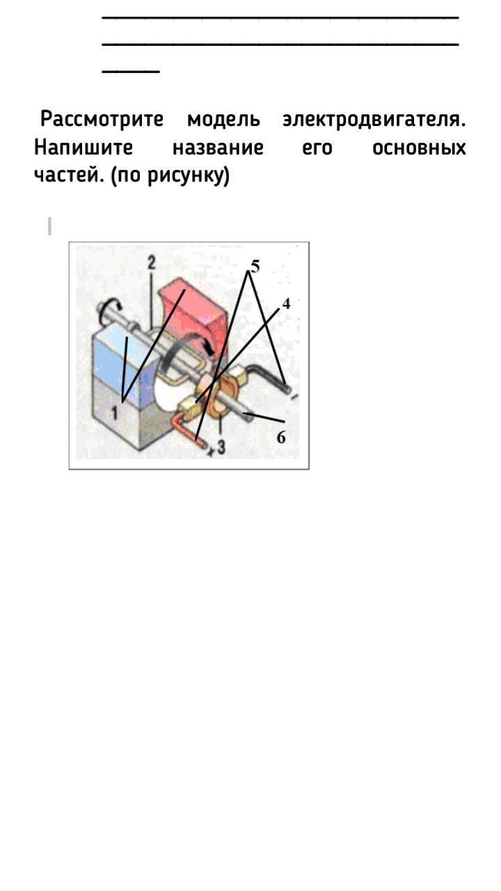 Рассмотрите модель электродвигателя. Напишите название его основных частей. (по рисунку)