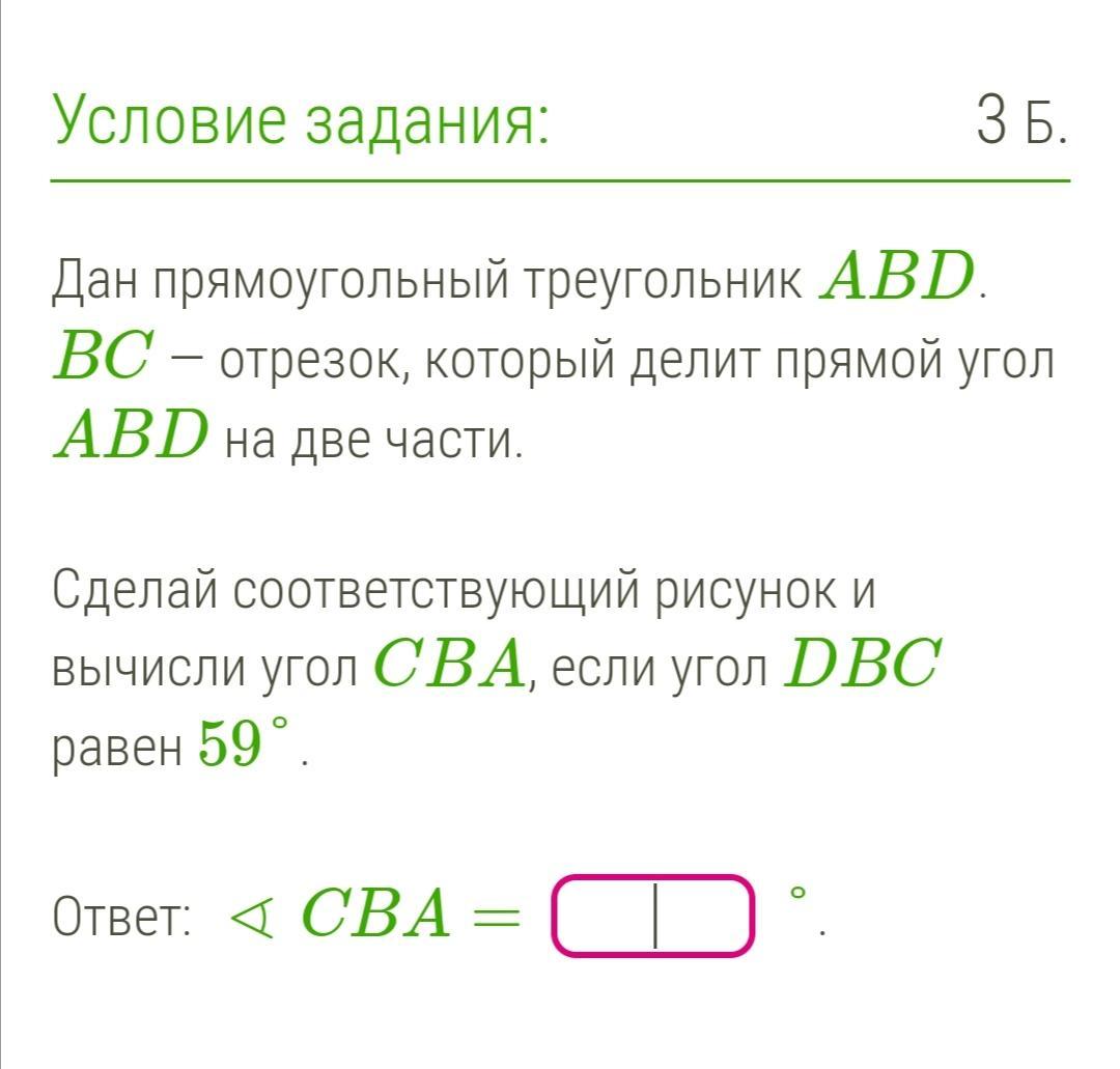 31°, <ABD = 90°; <ABD=<ABC+<CBD, отсюда <АВС=<АВD-CBD=90°-59°=31°