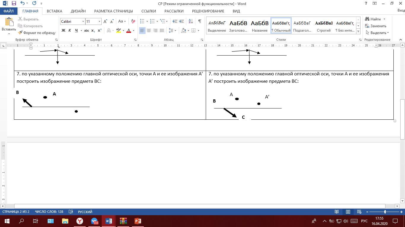 по указанному положению главной оптической оси, точки А и ее изображения А’ построить изображение предмета BC: