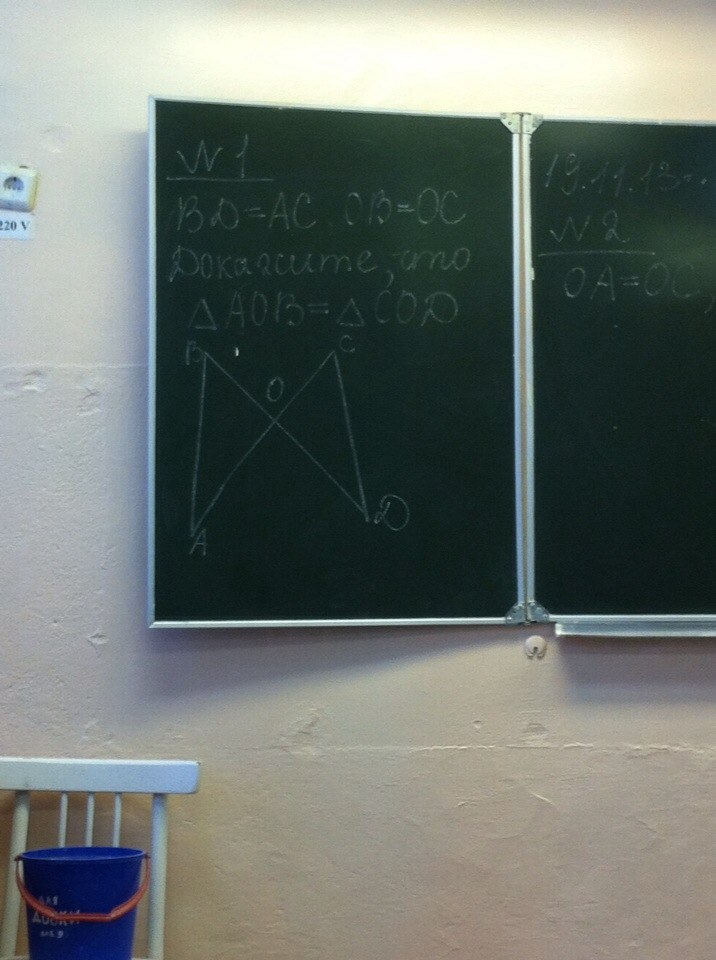 1) ОВ=ОС, АО=ОД, углы О вертикальные => треугольники равны по первому признаку равенства треугольников