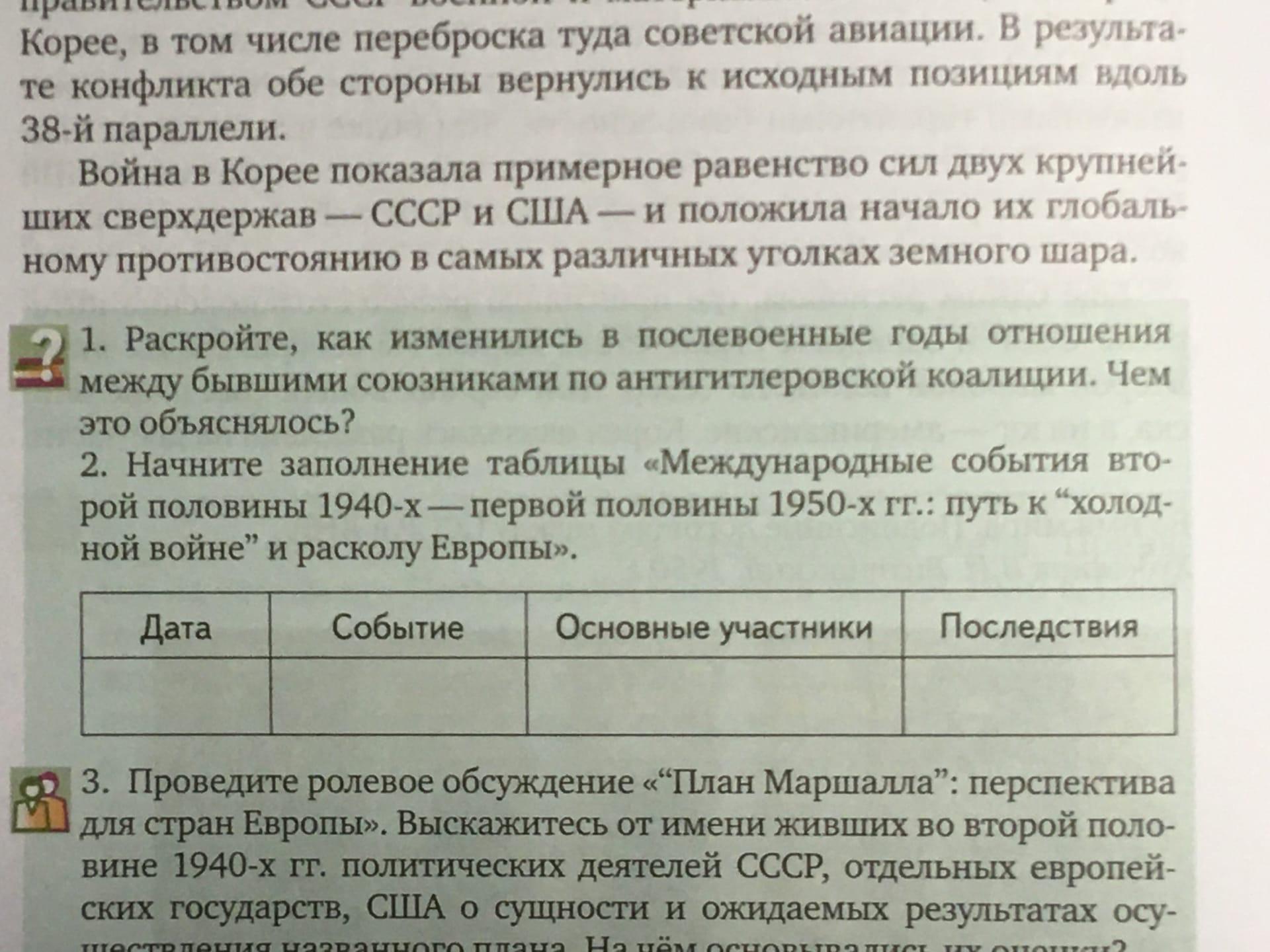 Второе задание. Начните с условной даты начала холодной войны. Затем в событиях испытание ядерной и водородной бомбы в СССР – последствие – обострение гонки вооружений.