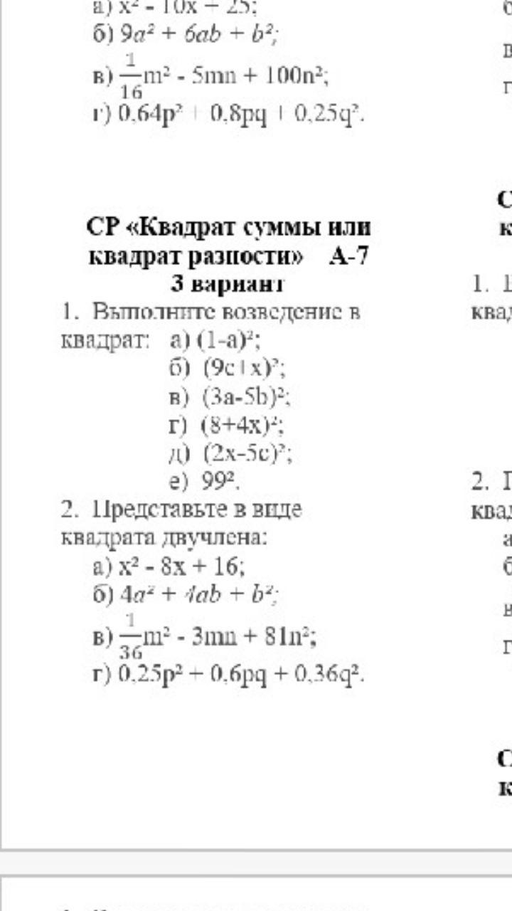 - г) 0,25p²+0,6pq+0,36q² = (0,5p+0,6q)² = (0,5p+0,6q)(0,5p+0,6q)
