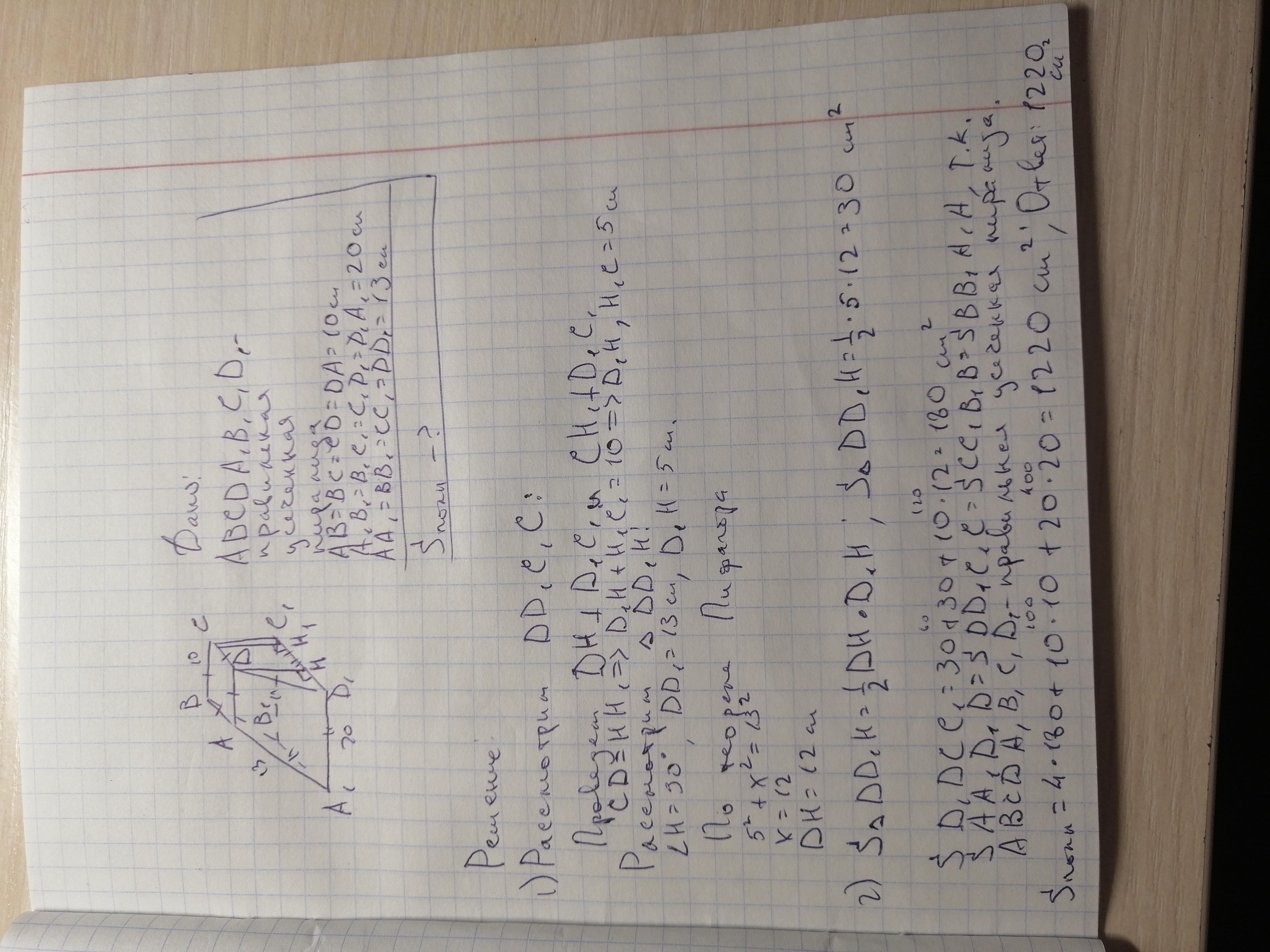 Основаниями правильной усеченной пирамиды являются четырёхугольники со сторонами 20 и 10. Боковое ребро усеченной пирамиды равно 13. Найдите площадь полной поверхности усеченной пирамиды.