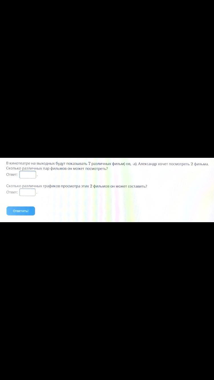 В кинотеатре на выходных будут показывать 7 различных фильм(-ов, -а). Александр хочет посмотреть 2 фильма. Сколько различных пар фильмов он может посмотреть?