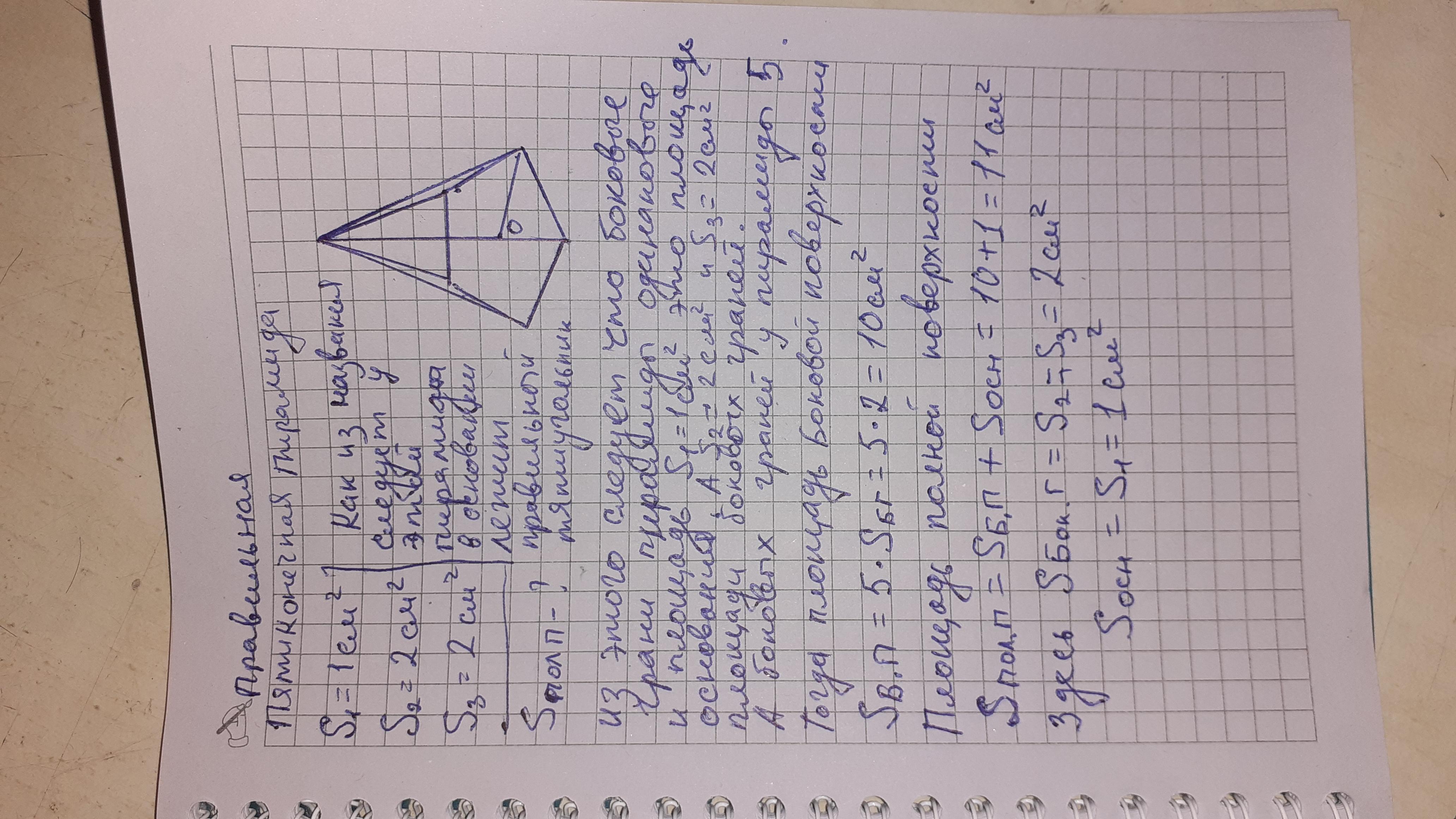 В правильной пятиконечной пирамиде три грани имеют площади 1 см², 2 см², и 2 см². Найдите площадь полной поверхности этой пирамиды