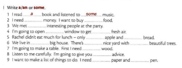 Объяснение: some- для неисчисляемых , an- то же,что и a только ставится ,когда следующее слово начинается с гласной (an apple ,an animal)