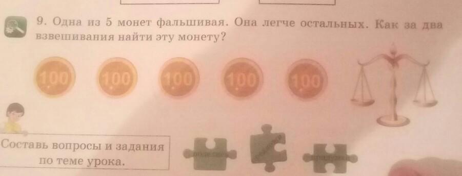 2. Одна из чаш перевесила. Тогда берем, ту , что легче и монеты, которые лежали в ней взвешиваем по отдельности. какая ваша поднимется, в той и лежит фальшивая монета