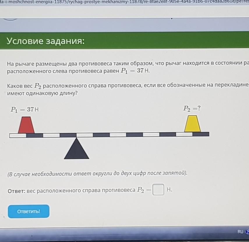 На рычаге размещены два противовеса таким образом, что рычаг находится в состоянии равновесия. Вес расположенного слева противовеса равен P1=37Н.