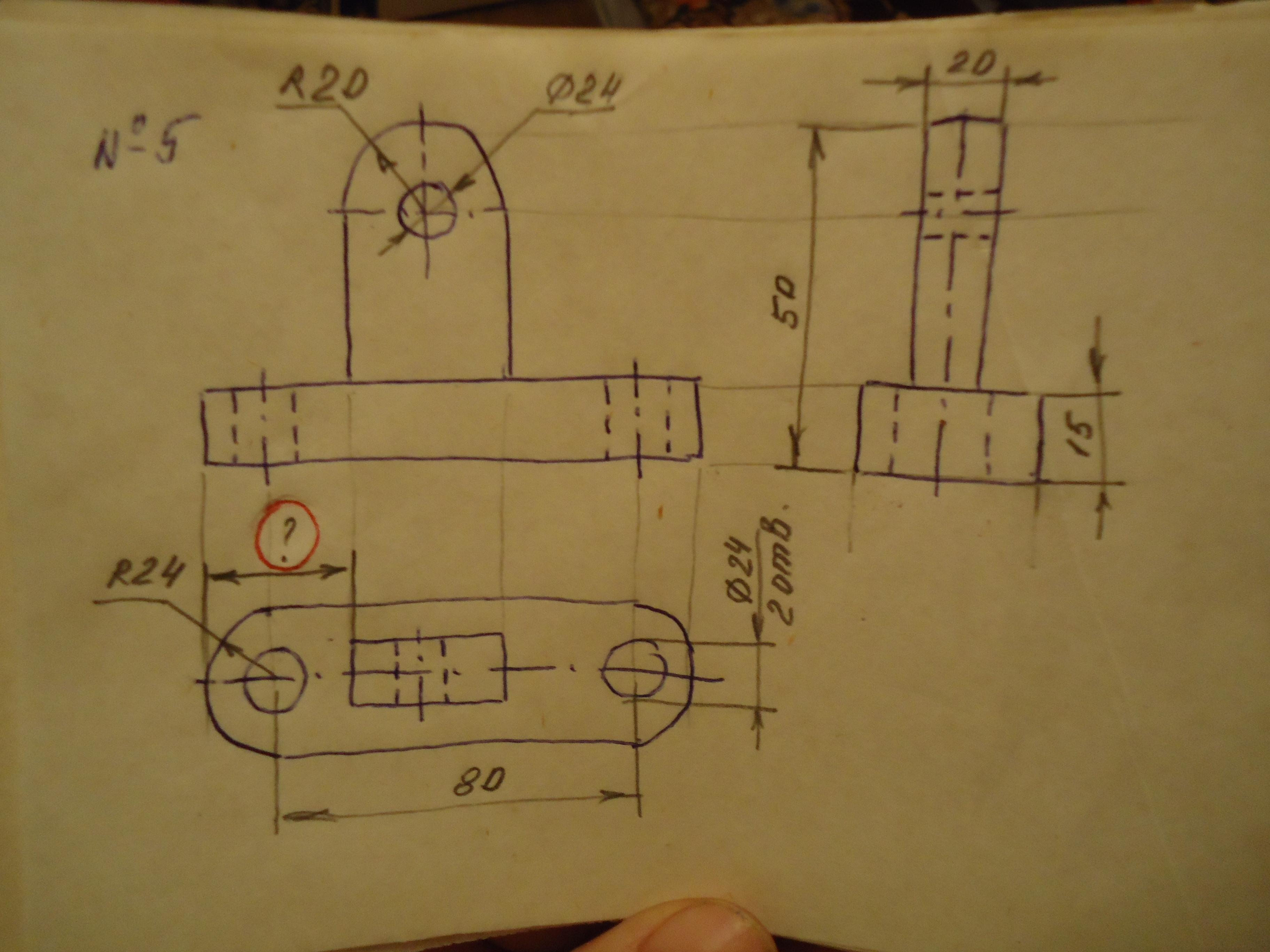5) Вид сверху: на изометрической проекции хорошо видно, что верхняя часть детали расположена не по центру основания, поэтому нехватает размера, на сколько она удалена от левого края детали.