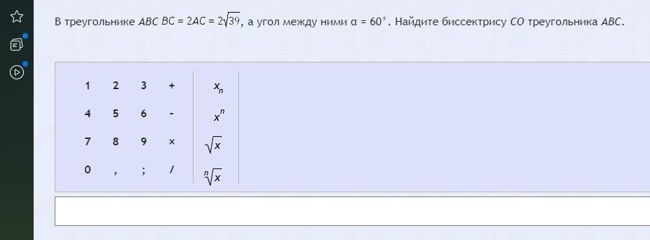 В треугольнике АВС ВС=2А=2корня из 39,а угол между ними а=60°. Найдите биссектрису СО треугольника АВС.