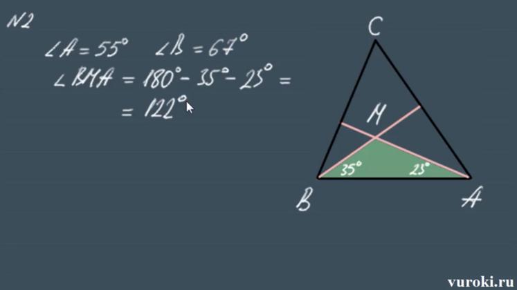 высоты треугольника пересекаются к точке М найдите угол ВМА если угол А=55 градусам , а угол В=67 градусам.