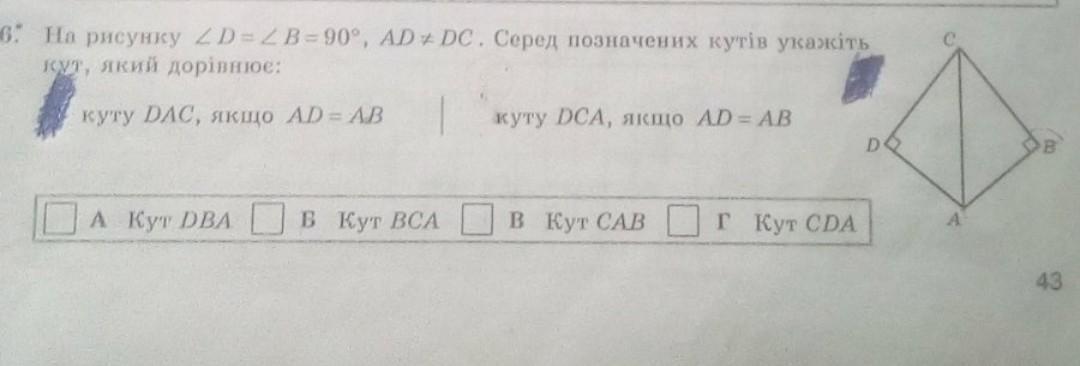 на рисунку кут D = куту В =90°,АD паралельна DC,Серед позначених укажіть кут який дорівнює куту DCA ,якщо АD. = AB
