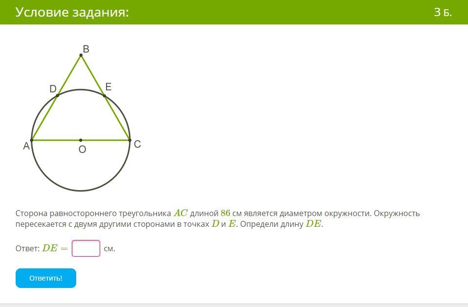 Объяснение:Проведём ОД=OE=R=86 : 2 = 43 (см). По свойсвам углов равностороннего треугольника АВС: ∠А=∠С=60°⇒ΔАОD=ΔCOE=ΔDOE-равносторонние⇒⇒DE=43 cм