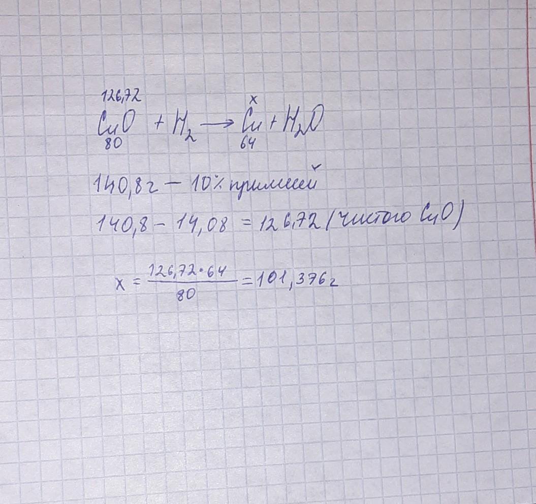 над порошком оксида меди (2) массой 140,8г содержащего 10% примесей пропустили водород. Найдите массу выделившейся при этом меди
