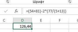 Вычисли значение математического выражения в MS Excel: (54+81)−2(77:(5+13)). (Ответ округли до сотых)