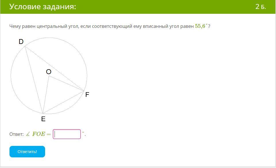 2) если центральный и вписаный углы опираются на одну и ту же дугу, то вписаный угол равен половине центрального и наоборот, центральный угол в два раза больше вписаного угла, получаем 55.6*2=111.2°