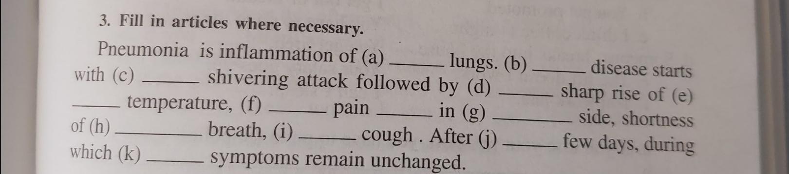 Pneumonia is inflammation of (a) lungs. (b) The disease starts with (c) a shivering attack followed by (d) a sharp rise of (e) temperature, (f) pain in (g) the side, shortness of (h) breath, (i) cough. After (j) a few days, during which (k)