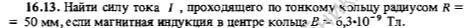 Найти силу тока I, проходящего по тонкому кольцу радиусом R = 50мм, если магнитная индукция в центре кольца B=6,3*10^-9 Тл.